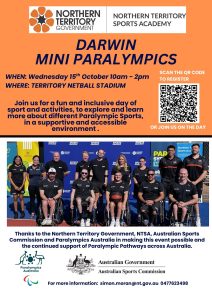 Date Oct 15 2025 Time 10:00 am - 2:00 pm Young PeopleYouth Sector Darwin Mini Paralympics When: 15th October 2025 Where: Territory Netball Stadium Time: 10am – 2pm Region: Darwin, Palmerston & Litchfield Share this event + Add to Google Calendar + iCal / Outlook export Location Territory Netball Stadium 235 Abala Road, Marrara NT 0812, Australia 00 days 00 hours 00 minutes 00 seconds Organizer NTG